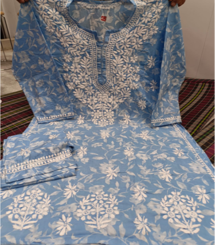 Cloudy Blue Printed Chikankari Kurti with Matching Printed Palazzo Suit (2-Piece Set)
