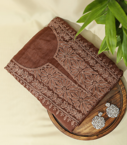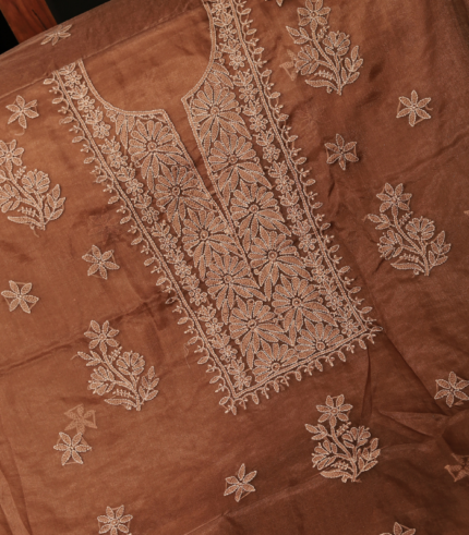 Warm Cocoa Brown Chikankari Embroidered Organza Fabric
