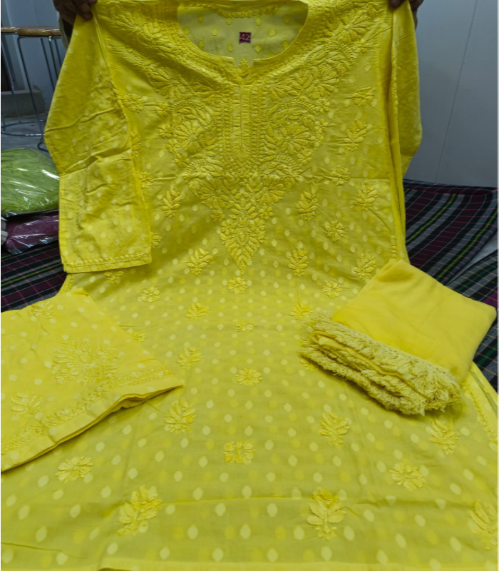 Step into timeless elegance with this beautifully crafted ethnic set made from premium pure dobby cotton. Featuring tone-to-tone Lucknowi Chikankari hand embroidery and a graceful silhouette, this outfit is perfect for refined everyday wear and special occasions.