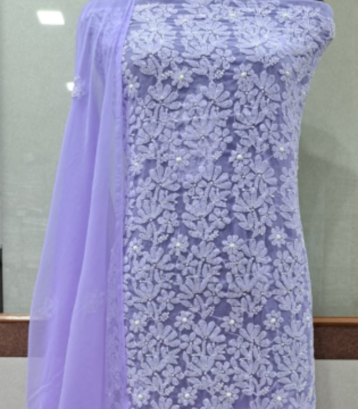 Lucknow Chikan unstitched georgette suit length is well crafted pastel colour unstitched georgette suit. This set consists of a kurta length 3mts with all over jaal chikankari work with Resham thread, salwar offering light chikan work on it’s hem and a georgette dupatta 2.5mts with some little embroidery with thread. This suit piece is a good wear to offices and other formal as well as casual events. This suit will add more charm and elegance to your personality.