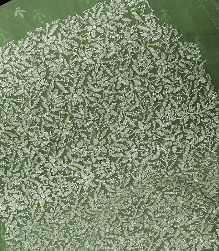- Embroidery: Heavy all-over floral & leafy embroidery