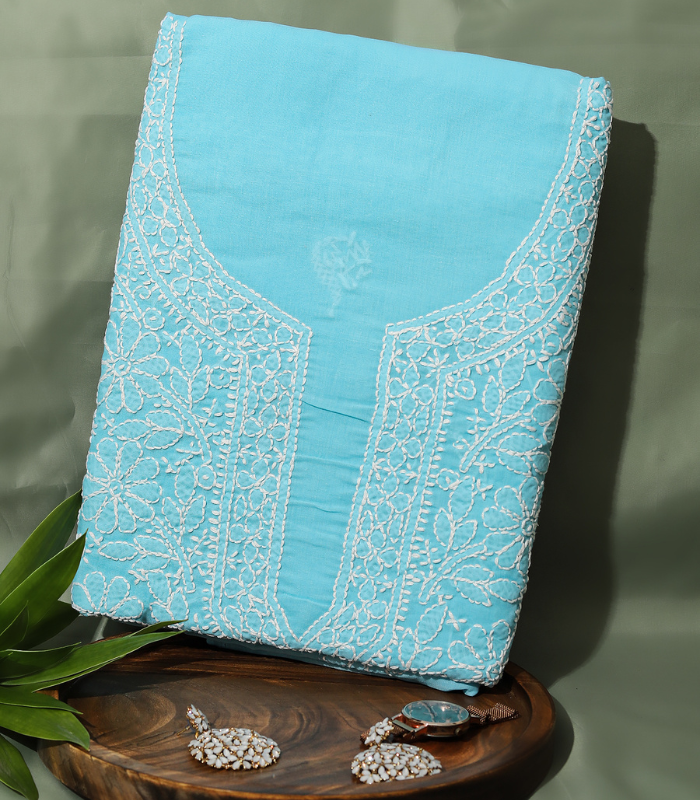 The refreshing aqua shade paired with classic white embroidery makes it ideal for festive gatherings, office wear, casual outings, and summer celebrations.