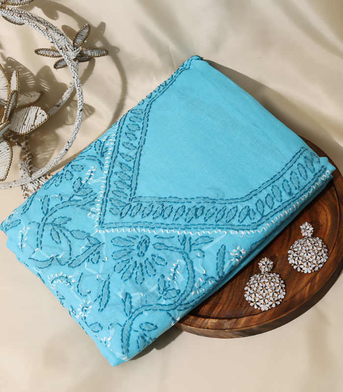 Brighten up your wardrobe with this refreshing Aqua Blue pure cotton suit set, beautifully adorned with intricate tonal floral embroidery for a soft yet striking appeal.
