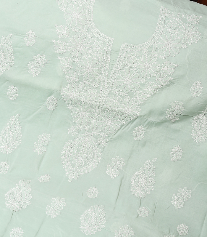 Brighten up your wardrobe with this charming Mint Green cotton suit set, beautifully adorned with intricate white floral embroidery for a soft and graceful appeal.